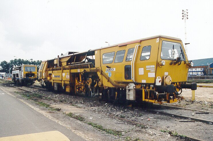 Plasser & Theurer Rail Joint Straightener. 86101 stands at the entrance to Toton depot on Sun 30th Aug 1998. Behind this vehicle is 410/73502, a Plasser & Theurer 08-16/90 ZW Tamper which is currently operated by private contractor, Balfour Beatty.