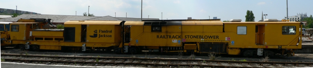 A Pandrol Jackson Stoneblower in Railtrack livery/branding at Bristol Temple Meads.