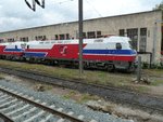 New electric locomotive H (Eta) 561 (built by Siemens/Krauss-Maffei) for the Greek railways OSE, parked between a class 141 locomotive and a measuring car of the German railways. The locomotive was apparently there because of test runs which however had paused on that Sunday.