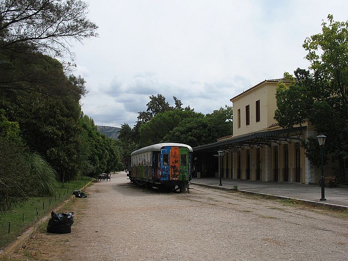 OSE - Greece The old railway station of Nafplio was located in the center of the town. The station area has been converted into a park, and the station into a music school. But the station restaurant is still a bar with cool drinks and a nice terrace. Nafplio, 08-05-2003 Digital photo by Marco van Uden |