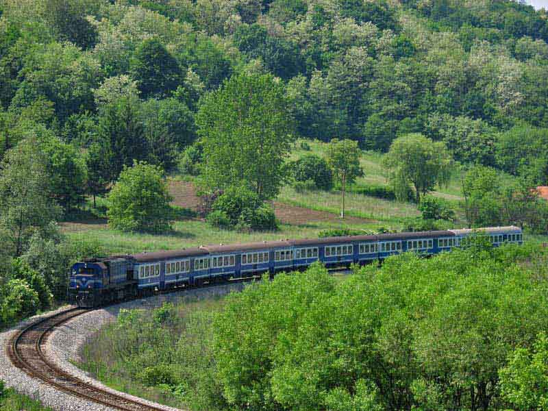 HŽ diesel locomotive 2044-012 passing through railway station Novi Marof on Zagreb-Varazdin mainline pulling the fast train no. 205 from Zagreb to Budapest (Hungary). 04 may 2005.