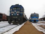 HŽ diesel locomotive 2044-016 and dmu 7121-003 side by side. Varazdin's railway station. 05 mar 2005.