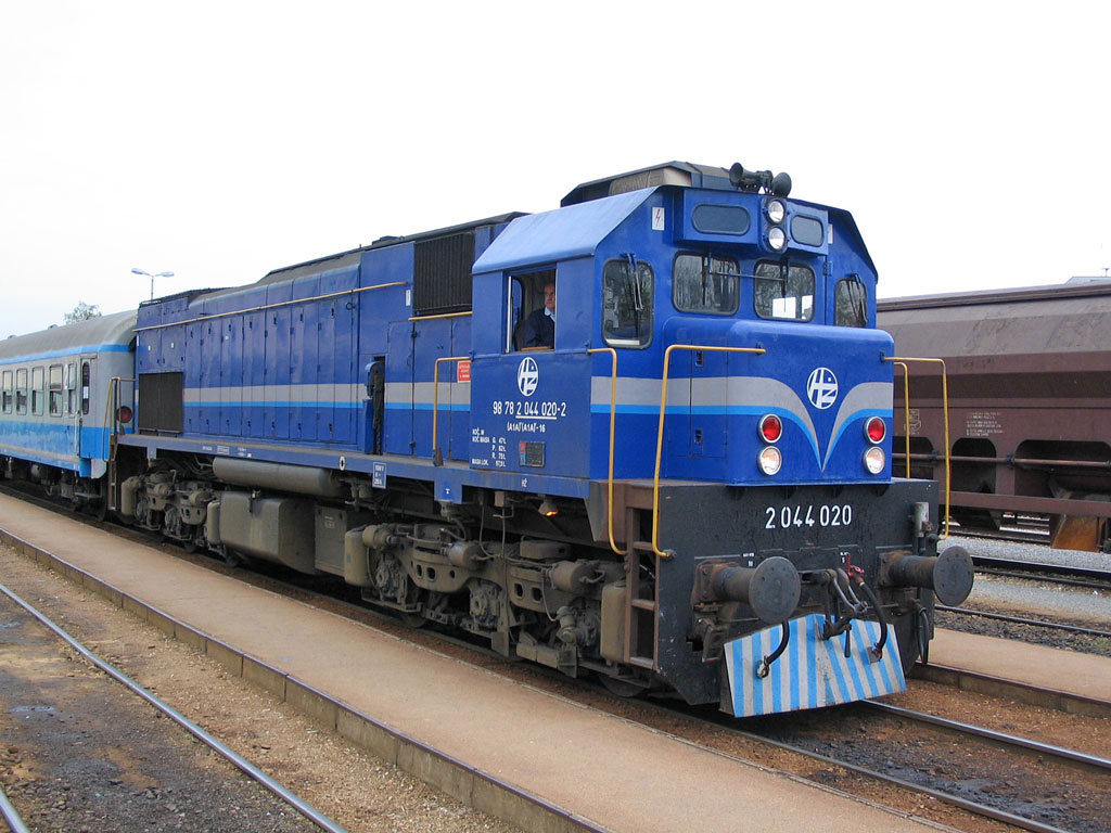 A HZ 2044-020 ahead of a local passenger train, waiting at Varazdin station to leave in direction Zagreb.(16th of September 2005). On the right is a HZ 2044 008 ahead of a freight train.