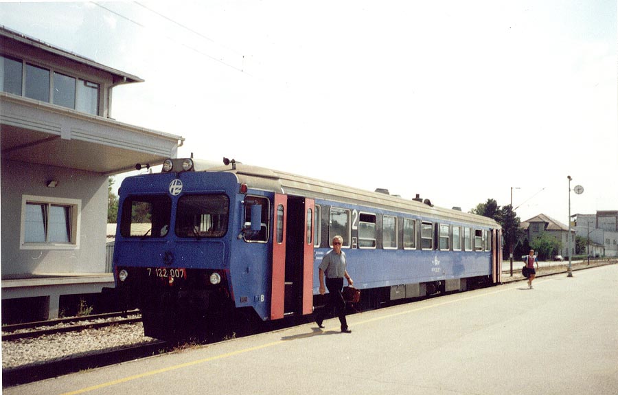 The HZ 7122-007 DMU, the sole unit of the Swedish series in its (original) blue livery, photographed at Koprivnica railway station on 2000/08/29 at 14:30, just after it arrived with the train no. 6808 from Virovitica.