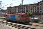 An electric locomotive with number 91 78 1141 304 - 1, owned by HZ (Hrvatske Zeljeznice / Croatian railways) at railway station Zagreb Gl.K. before pulling a passsenger train.