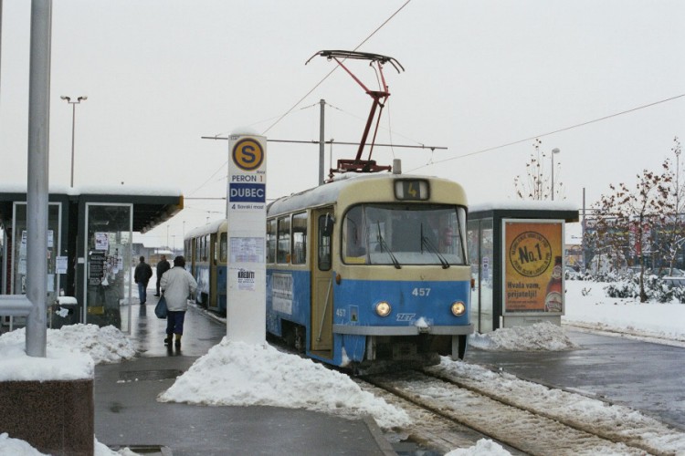 Zagrebacki Elektricni Tramvaj (ZET) T4YU-Tram at Terminus Dubrava December 2005 Photo: A. Schulz(andreas.schulz@broksen.de) |