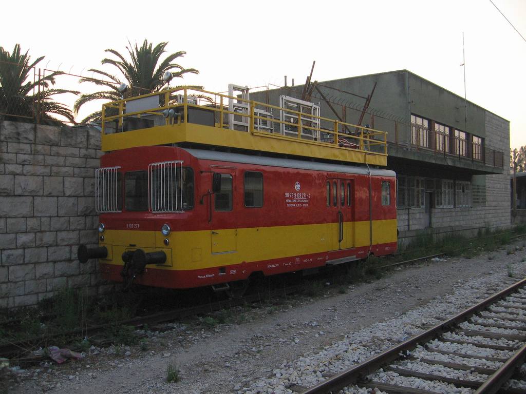 A service vehicle from the HZ 9103 series, used for renewal and replacement of the catenary. This was pictured on 2000/07/31 at 12:37 at Skrljevo Station, 12 km away from the harbour of Rijeka (Adriatic sea is seen in the background). At the time, the re-electrification of Moravice - Rijeka line from 3 kV = to 25 kV ~ 50 Hz was in progress; and the catenary itself was being replaced during the daily closure of the line, approximately about noon.