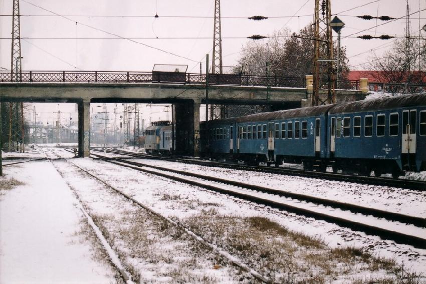 The international train 354-1 "Béga" (Timosora - Budapest) and the slow train 3313 (Szolnok - Budapest) was run together between Rákoshegy and Budapest Keleti at that day. This long train had two locomotives but only one was pulling the train. The other loco was at the end of the train. The picture was taken at the level-crossing "AS 33" between Rákoshegy and Rákos. 03.07.2002