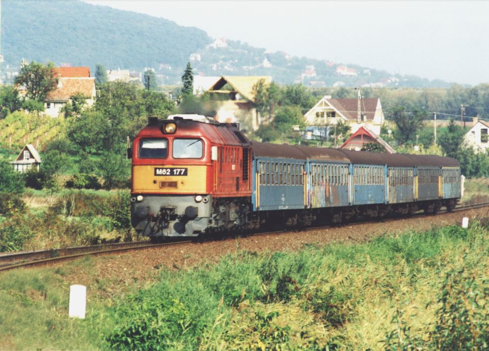 Diesellok der MAV M62 177 "Sergei" mit der Eilzug 16907 vor Bahnhof Balatonfüzfő auf der MAV KBS 29. 26. 07. 2001.