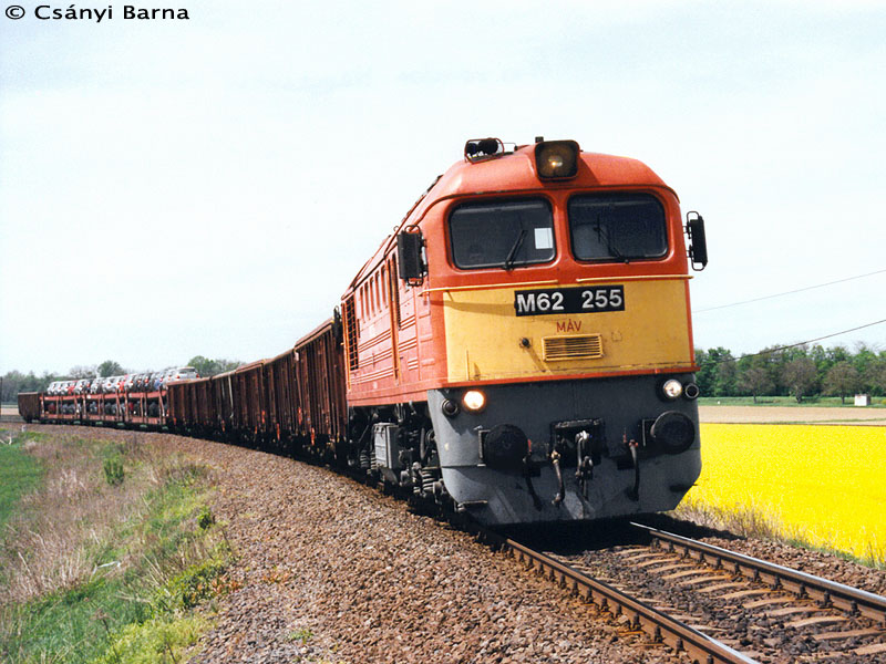 MÁV M62 255 leaves Zalaszentiván with freight train towards Nagykanizsa, 4 May 2003.