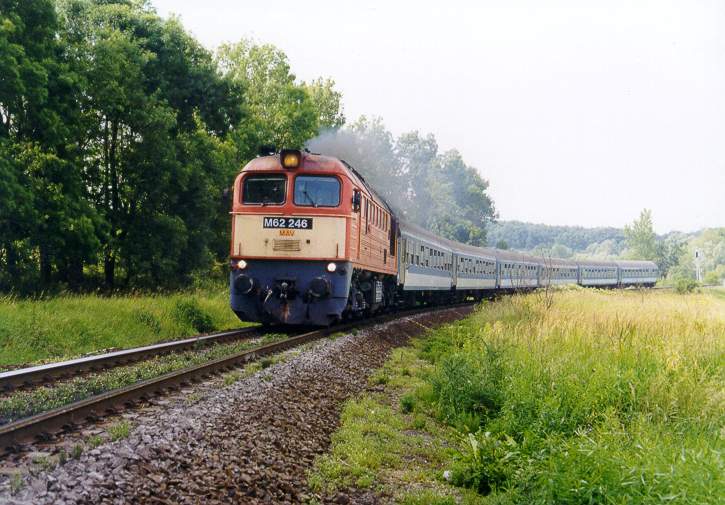 M62,246 with a fast train heading to Szombathely in June 1999. Photo taken in the mountainland of Bakony, near Veszprém, on the Budapest-Szombathely line. This line is now under electrification so this is one of the last occassions to find M62s here.