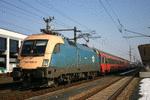 MÁV dual system locomotive AC 25 kV/15 kV (6400 kW, 230 km/h, asc, cc, async. trac.) in Budapest-Keleti with EN 466 "Wiener Walzer", ready for departure to Zürich. (March 2003)