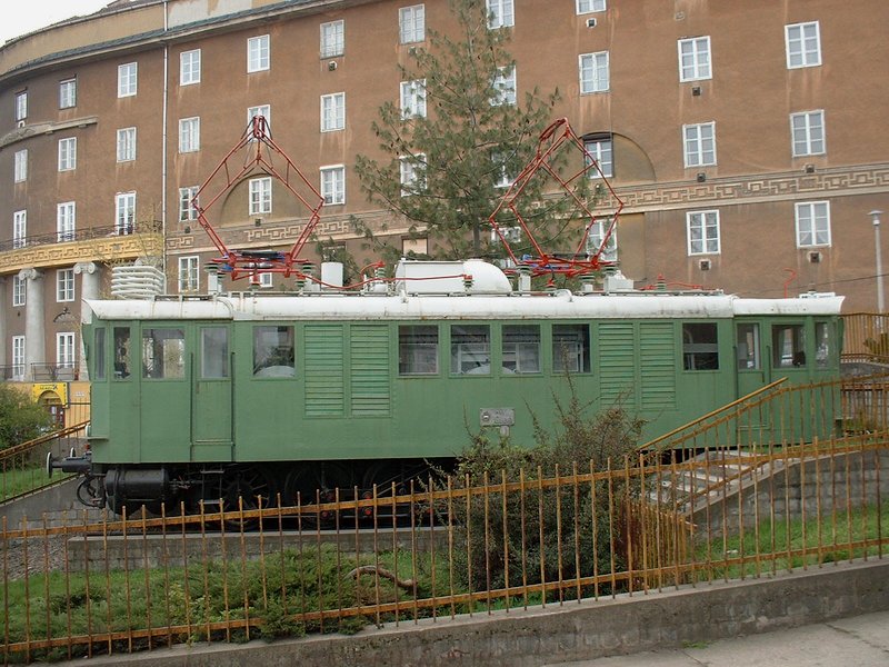 The only one remaining unit of the V60 locomotive. This was a Kando-type locomotive, similar to V40 but with six driven axles (F wheel arrangement) and 67 km/h maximal speed, for heavy freight trains (mainly coal trains from Oroszlany area to Budapest weighed 2000-3000 tons). Only 3 units were built (2 prototypes, 1 series). The locomotives were produced in 1932 (001-002) 1939 (003) In the middle of 60's they were withdrawn. The picture was taken at the High School name "Kando" where V60,003 is exhibited.