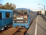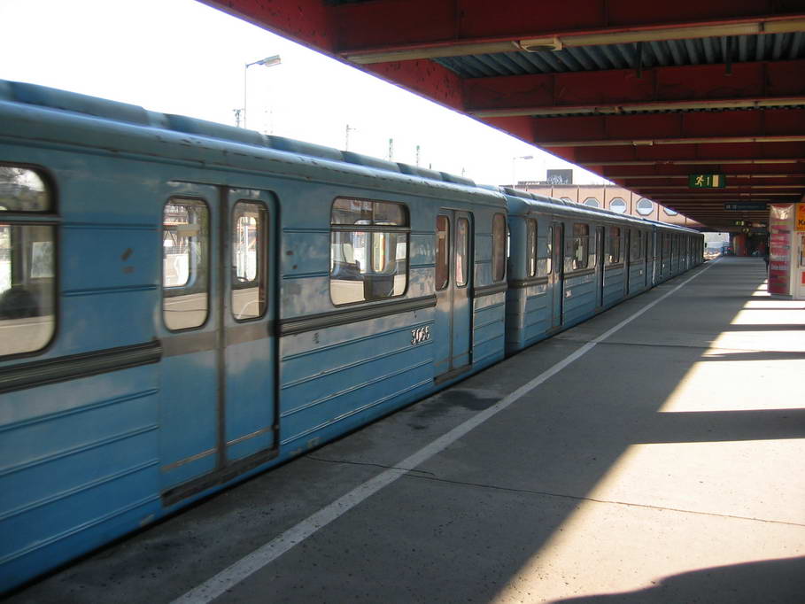 Budapest metro line trains arriving and departing from Kőbánya-Kispest station on Friday, April 23rd, 2010. The arriving train on the left is formed of 1970s designed EV stock and the departing train is composed of 1983 built 81-717 stock. Both designs were built in the Soviet Union.