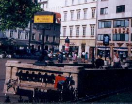 This is a the entry to the Metro M1 Vörösmarty tér station to Mexikói út. Nearby is the Vigadó which was demolished in 2004 (?) and is in the process of being rebuilt (as of February 2006 which was my most recent visit). To the left of the picture, there is the Cafe Gerbaud. Taken Saturday 1 August 1998 © 1998, 2006 Josh Hanz (josh_hanz@hotmail.com) |