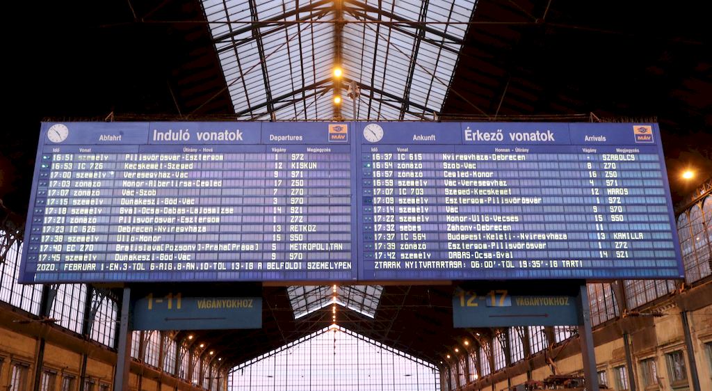 | Budapest Nyugati station, announcement board in a slightly older style. 2020-02-01. |