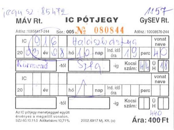 Hand written IC-reservation Körmend - Szentgotthard; issued at Körmend (MAV), 2003-08-10.