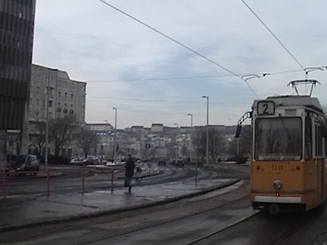 A tram 1330 serving line 2 on the Pest side of the Danube, has left Kossuth Tér to run southwards, past Lanchid (chain bridge) and Erzsebet Hid (Elizabeth Bridge), in Budapest, Hungary. To the right, not visible, is the Hungarian Parliament building. It was too early to get a tour at the time of the photo. Taken Monday 20 February 2006. © 2006 Josh Hanz (josh_hanz@hotmail.com) |