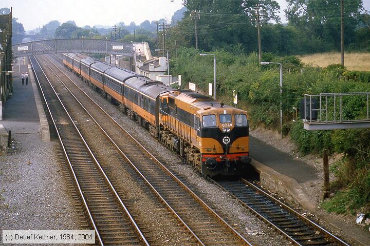CIE - 076 Personenzug mit Lok 076 beim Halt in Kildare am 22. August 1984. Die Lok der Class 071 wurde 1977 von General Motors in La Grange, Illinois, USA, gebaut und leistet 1828 kW. Kildare liegt 48 km (30 miles) südwestlich von Dublin entfernt an der Strecke nach Limerick.