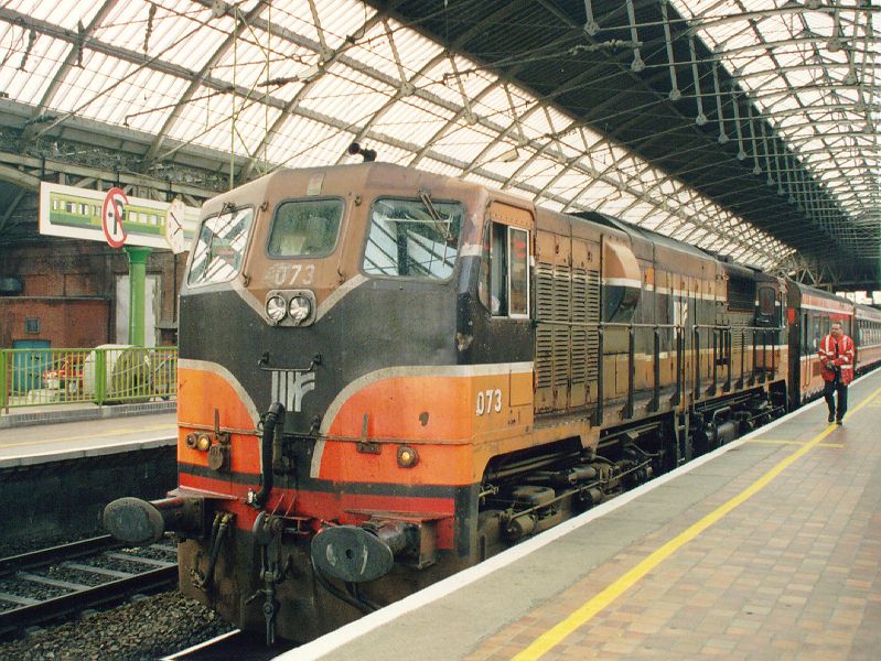 Ireland / Dublin // July 30,1998 around 13h45 In the Pearse station (near the Trinity College). Diesel loco 073. Photo and scan by Paul ROBERT (Belgium) {isims@arcadis.be} |