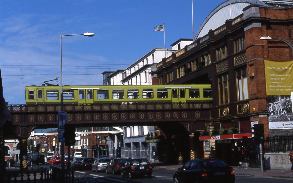 The only electric trains in Ireland are the DART (Dublin Area Rail Transit) EMUs which operate the Howth-Bray service via Connolly and Pearse stations. The two-car units usually operate in four-car formations during off-peak times. DMS 8114 leads such a formation into Connolly station on a northbound service. It displays the two-tone green livery, until recently shared with Dublin's buses. Two of these units are in a black-based advertising livery for Guinness, each coach being adorned with full-height lettering in a different bright colour. They normally operate together in a four-car set. Unfortunately they managed to elude photography during my short visit! Photo by Dave Root. |