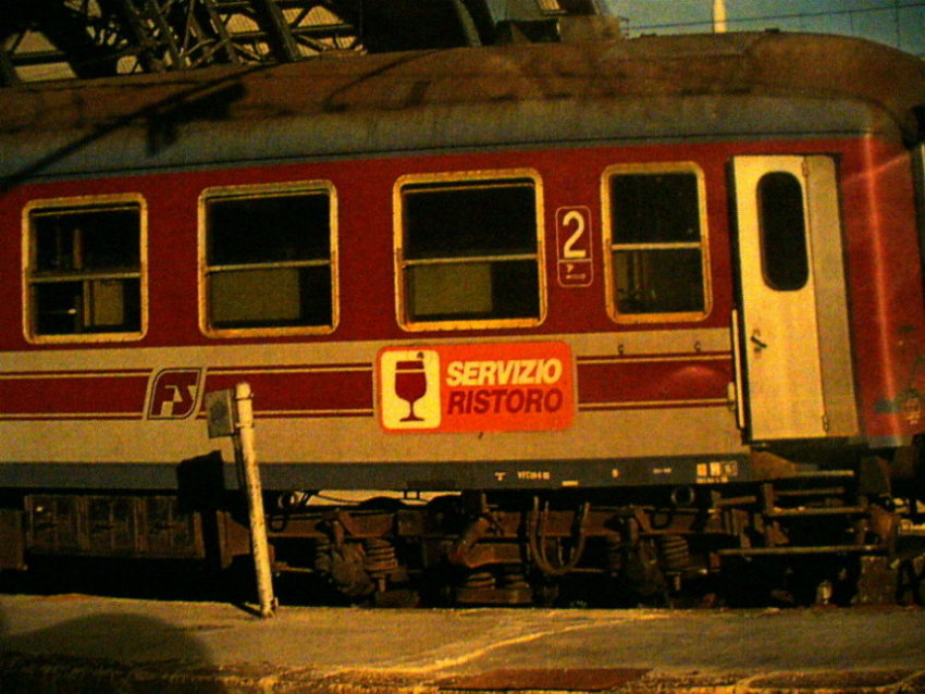 Note the thin red stripe at the bottom of the body on the cars: at that time FS didn't have enough UIC-Z 2nd class coaches to equip all IC trains, so a lot of UIC-X coaches were fitted for 200 kph speed, with hydraulic absorbers between body and bogies and window baffles against aerodynamic turbulences inside the compartments, and marked with a red sripe on the lower part of the body. Photo and scan by Jacopo Fioravanti (jacopofioravanti@katamail.com). |