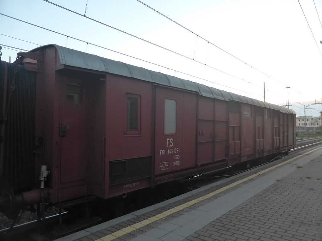 Trenitalia historical wagon FDIz 149-091 at Bologna Centrale Station on 18/02/204. This historical wagon is maintained by the "Fondazione FS", the Historical heritage and preservation branch of the Italian State Railways. Here is pictured at Bologna in an historical composition named "Treno della Memoria" to remember the Istrian-Dalmatian exodus of local ethnic Italians from Yugoslavia after the WWII.