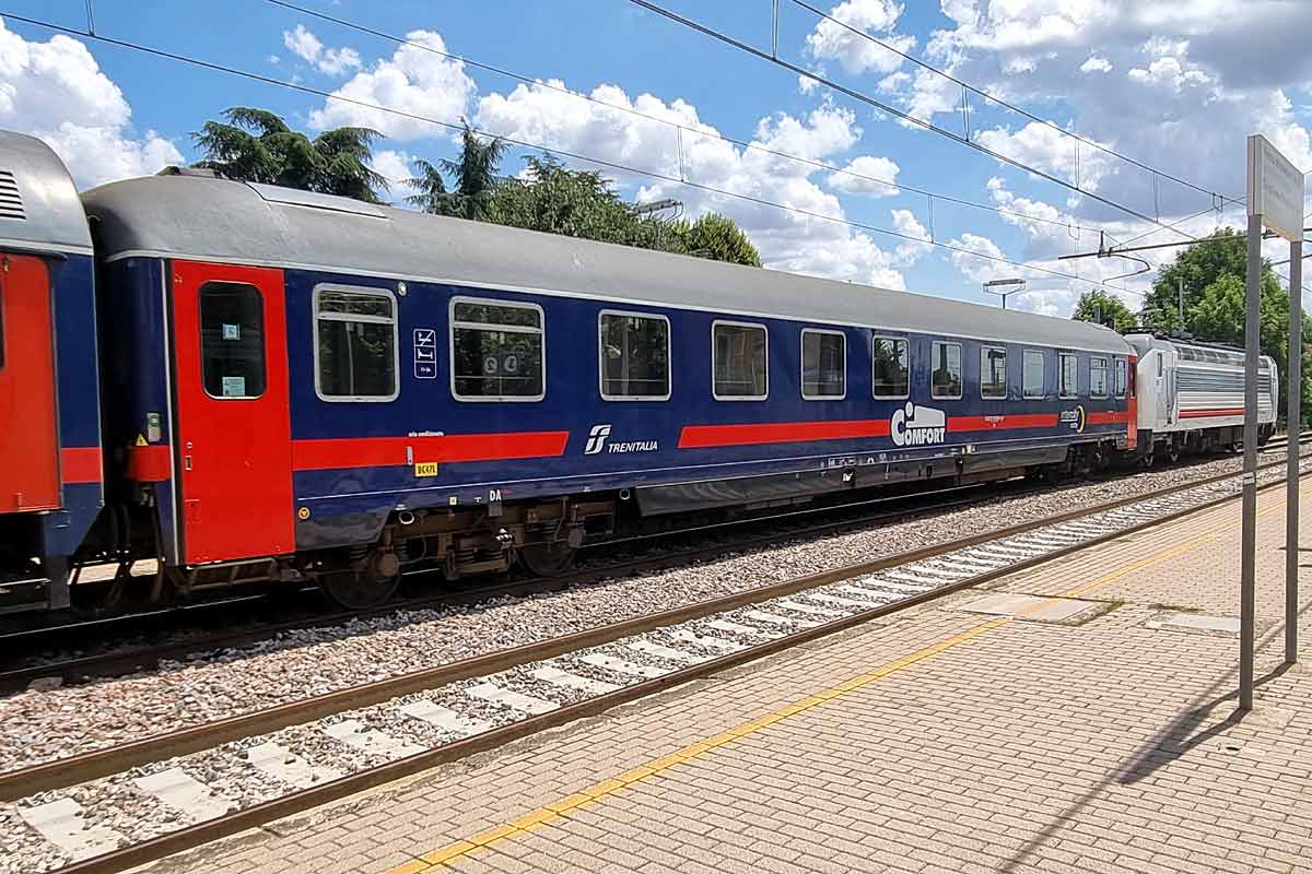 Trenitalia Coach IC Notte - COMFORT Bc 78 156 BC49 (NVR 50 83 59-78 156-6 I TI) at San Giorgio di Piano BO Station on 26/07/2023. This coach was in composition to a six coaches IC Notte Train headed by a simmetric double traction of E.403 locos (E.403-003 and E.403-022). The train remained (unusually) stabled for more than 24 hours at San Giorgio di Piano Station.