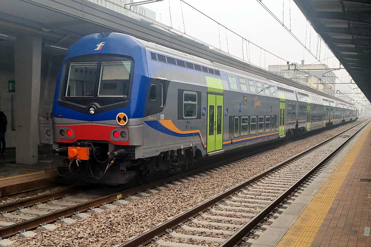 A consist of Trenitalia / DPR Veneto Vivalto double deck coaches, with a not better identified VIvalto Driving Trailer at the rear of the train, stops in a foggy morning at Venezia Mestre station. 06/02/2024.