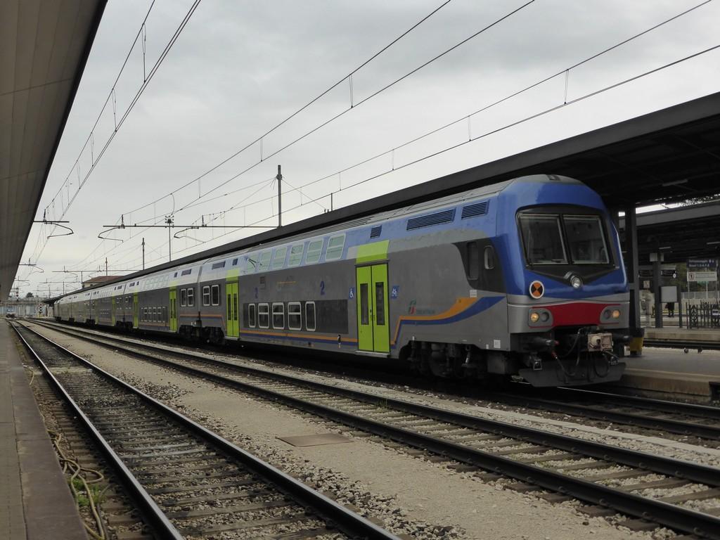 A double deck passenger car type "nB" of FS (Ferrovie dello Stato / Italian Railways) at railway station Venezia Santa Lucia in composition of RV 3447 to Trieste Centrale.