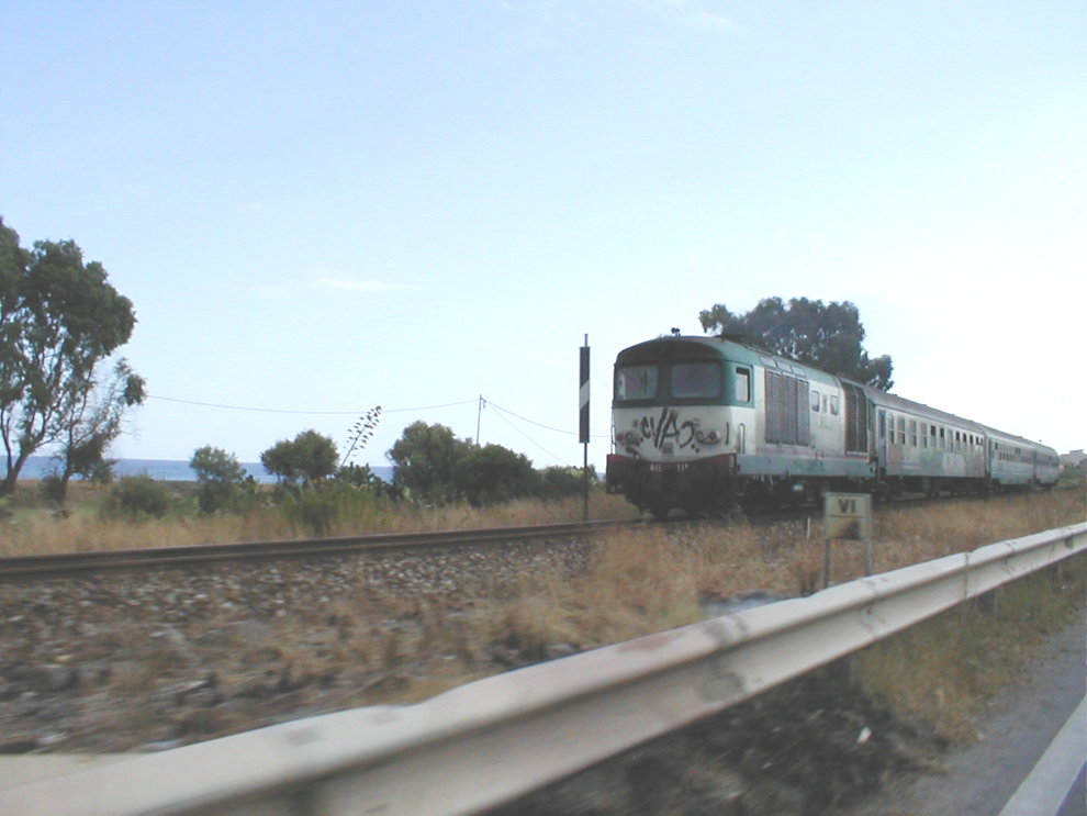 Una D445 in testa ad un treno Regionale, è qui ripresa a Brancaleone(RC), con il Mare Jonio sullo sfondo...