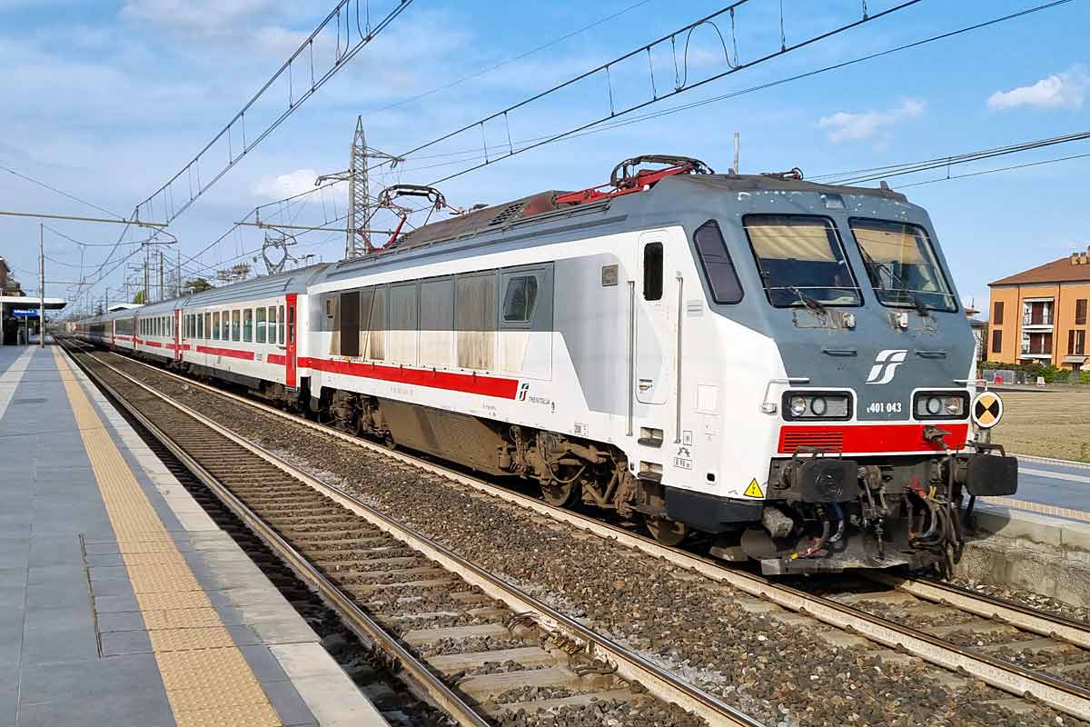 Trenitalia single cab Electric Loco E.401-028 (NVR 91 83 2401 028-2 I-TI) with an IC service at San Pietro in Casale BO Station on 28/07/2023.