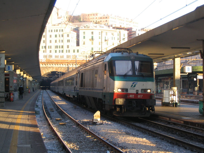 An FS Trenitalia electric loco class E402A E402A-017 is seen standing on platform 18 at Genova Piazza Principe with an Intercity Plus 518 "Lagrange" from Genova Brignole and is working the 16:08 service to Torino Porta Nuova. Thursday the 27th of December 2007