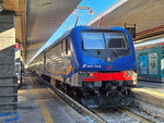 Trenitalia Single Cab electric loco E.464-636 (NVR 91 83 2464 636-6 I-TI) in the DPR color scheme, with only few graffiti on the front..., at Bologna Centrale station with its consist of MDVC & MDVE coaches ready to operate Fast Regio service to Brennero. 02/08/2025.