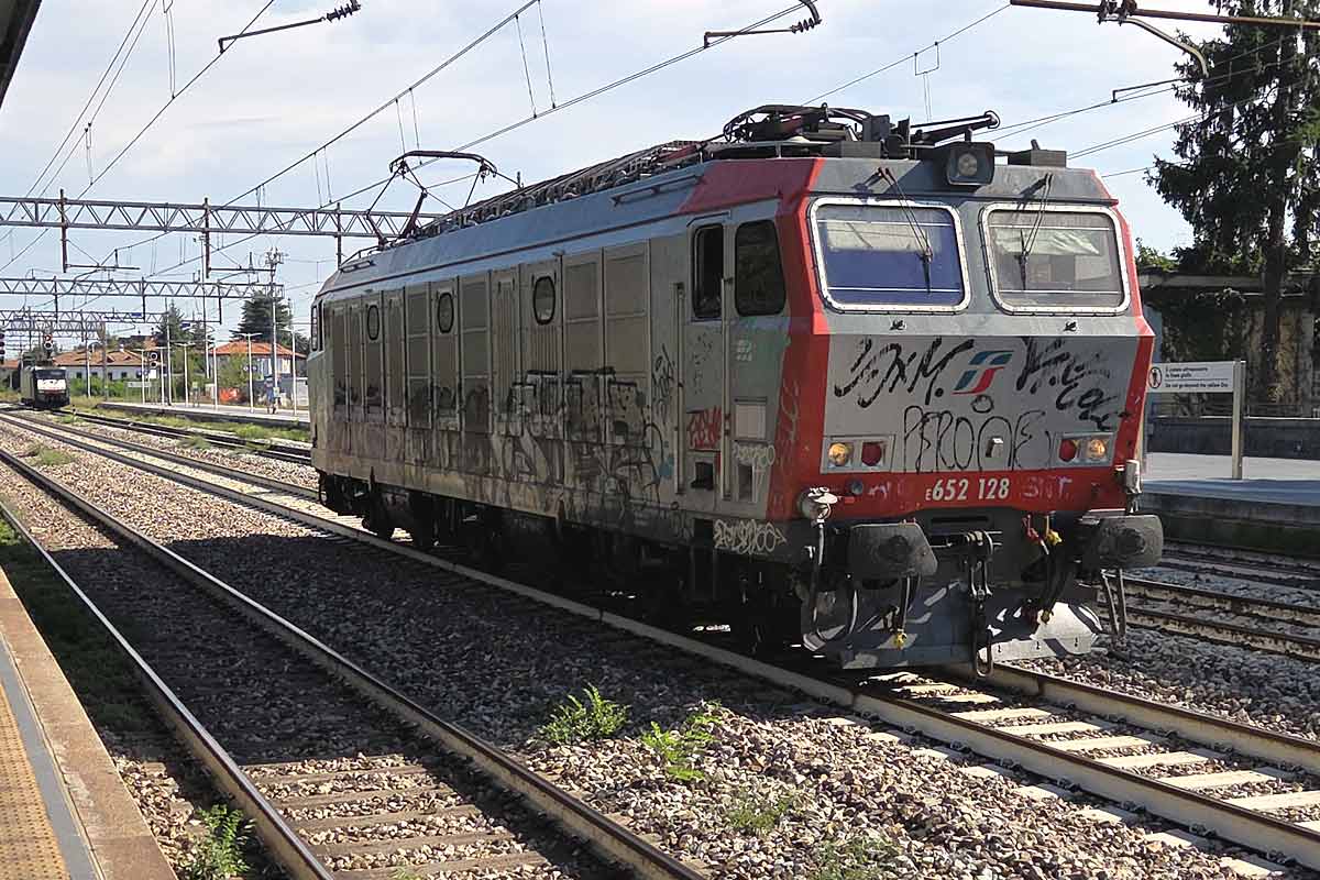 Mercitalia Rail classic 6-axles electric loco E.652-128 (NVR 91 83 2652 128-6 I-MIR), as usual full of graffiti, manouvering at Busto Arsizio station. 16/09/2025.