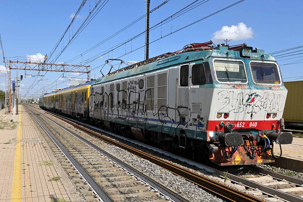 The leading loco is RFI Rete Ferroviaria Italiana E.652-040 (NVR 91 83 2652 040-3 I-MIR) still in faded and graffitted XMPR color scheme, the loco at the rear is E.652-170 and the two coaches in between (difficult to identify them...) should be unit 99611 (NVR 61 83 99-90 034-8 Vvlc) and unit 99610 (NVR 61 83 99-90 049-6 Vpmis).