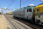 Unusual and unespected transit on track 2 at San Giorgio di Piano BO Station on 12/09/2025: a composition of simmetric double traction with locos E.652 wth two badly garffitted diagnostic coaches of the Aldebaran 2.0 diagnostic train. On duty or just a transfer?