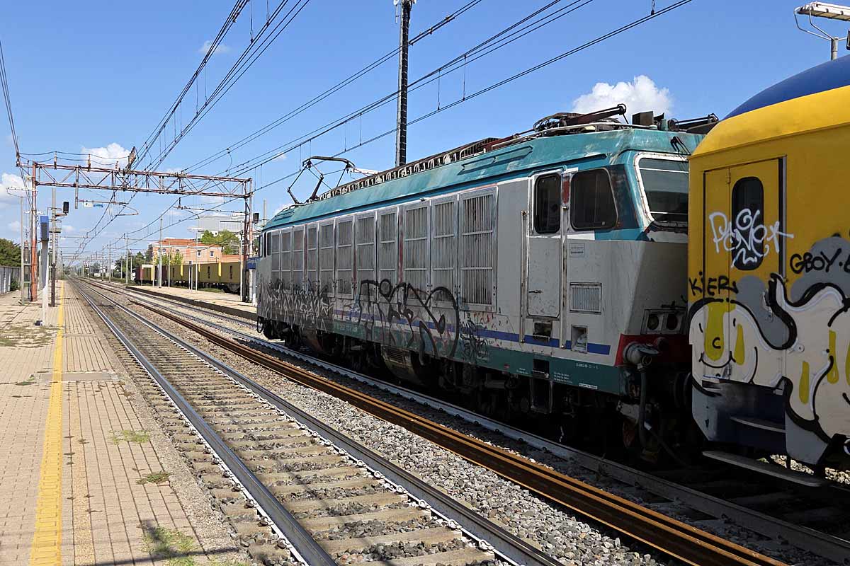 The leading loco is RFI Rete Ferroviaria Italiana E.652-040 (NVR 91 83 2652 040-3 I-MIR) still in faded and graffitted XMPR color scheme, the loco at the rear is E.652-170 and the two coaches in between (difficult to identify them...) should be unit 99611 (NVR 61 83 99-90 034-8 Vvlc) and unit 99610 (NVR 61 83 99-90 049-6 Vpmis).