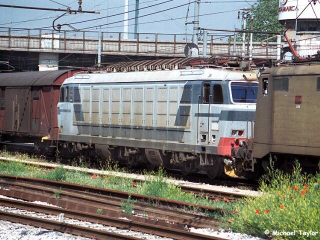 FS Class E652 Electric Locomotive. E652.058 at Venice S Lucia station on Monday afternoon September 17th, 2001. The crudely handwritten loco number on the front is interesting. Perhaps it is a result of a graffiti clean-up at a local engine shed. Paintwork on the side is also very patchy.
