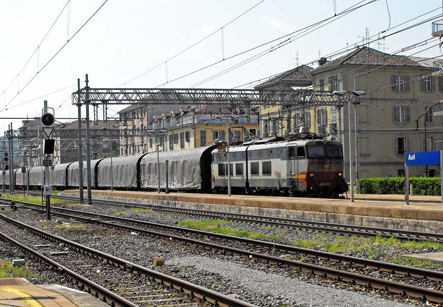 Station of Asti (line Torino-Genova) looking west: the loco Trenitalia E655 304 is hauling a train of iron colis in direction of Torino; 05.08.2008 .