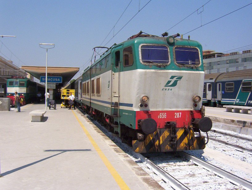 FS E656 287 appena arrivata a Siracusa con l'Espresso 1923 Trinacria da Milano Centrale.