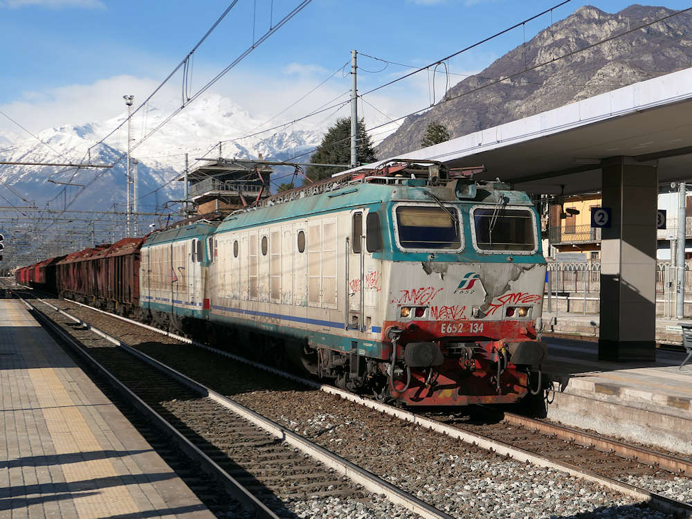 Mercitalia - Italy Mercitalia (freight arm of FS/Trenitalia) electric locomotive E.656 134 and an unidentified second locomotive run through Bussoleno with a freight train. Bussoleno, 11-02-2018 Digital photo by Marco van Uden |