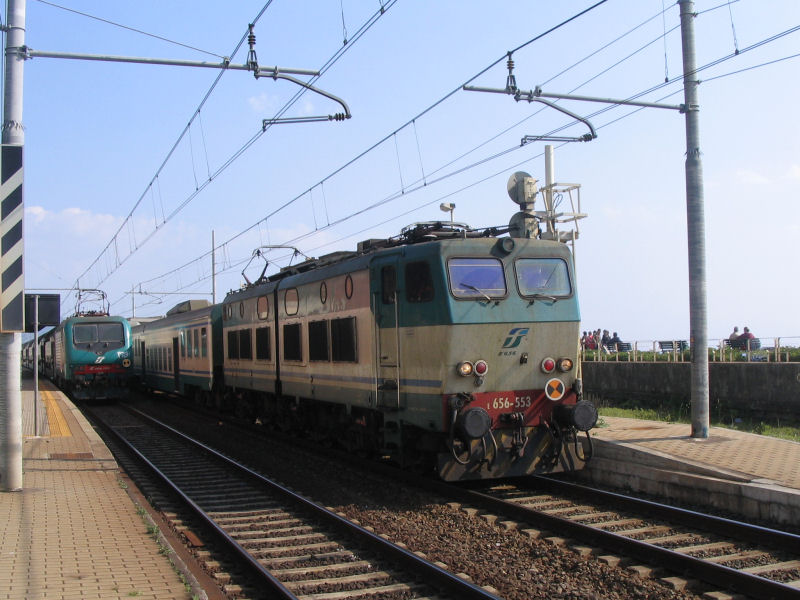 An FS Trenitalia electric loco class E656 E656-552 is seen standing on platform 2 at Sestri Levante station. This electric locomotive is reversing with a Regional train from Parma and is on a service with the 10:44 to Genova Brignole. Thursday the 26th of July 2007