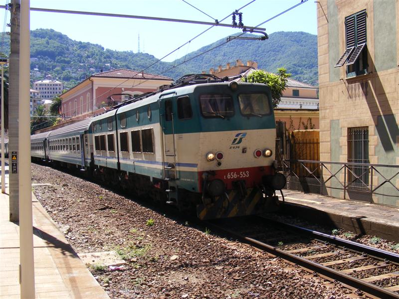 FS Trenitalia electric loco class E656 E656-557 at Chiavari station with a Interegional train from Albenga to S.Stefano di Magra.