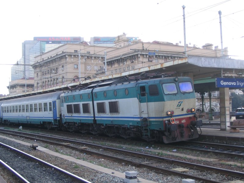 FS Trenitalia electric loco class E656 E656-603 stands on platform 3 at Genova Brignole with a northbound Regional train beginning a service with the 12:17 direct to Torino Porta Nuova.