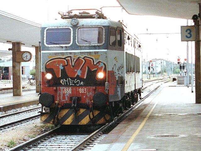 FS Class E656 Electric Locomotive. E656-083 runs light engine through platform 3 at Treviso at 17:40 on Sunday September 16th, 2001. This loco was carrying the same large graffiti emblem on the front in June, also at Treviso.