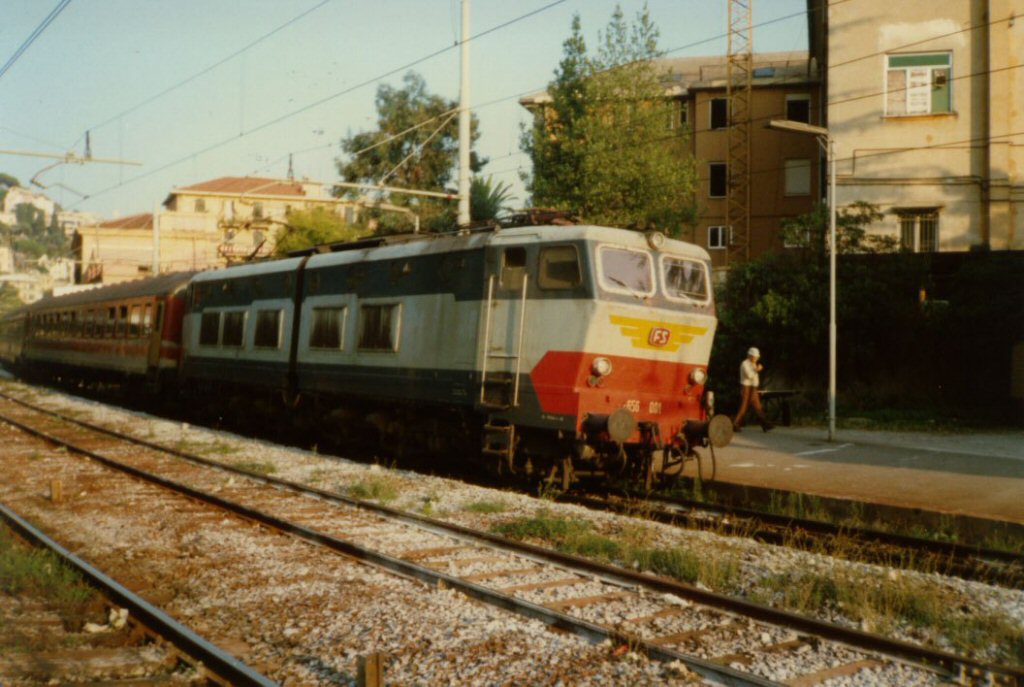 Locomotore elettrico serie E656 "Caimano" delle Ferrovie italiane FS al traino di un InterCity diretto a La Spezia. Era il 16 luglio 1996.