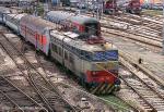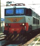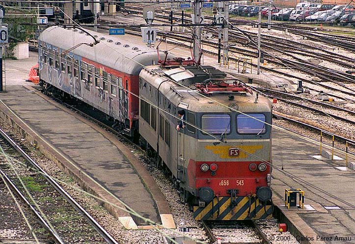 Locomotora electrica 656 arrastrando un tren de pasajeros. Electric locomotive of FS class 656 with pasanger coaches. Bolonia - 11/2000