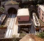 An E656 with passengers train arrives in Vernazza in the Cinque Terre area, between Genova and La Spezia. The greater part of this station is in four tunnels, the picture shows all of the station that is 'in the open air'. Vernazza (Liguria, Italy), July 2001.