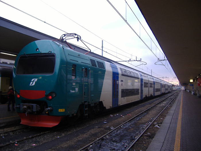 XX Olympic Winter Games Torino 2006 - only two more days to go - 25/02/2006: FS bilevel trainset TAF (Treno Alta Frequentazione or high-capacity train) no. 19 in Torino Porta Nuova, the city's main station, ready for departure to Pinerolo as train R31257 at 1730 hrs.
